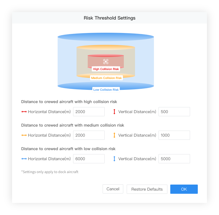 ユーザーは、マップの右下隅のをクリックして、マップ上に低および中程度の衝突リスクの警告を表示するかどうかを選択できます。また、有人航空機との衝突リスクの閾値をカスタマイズすることもできます。