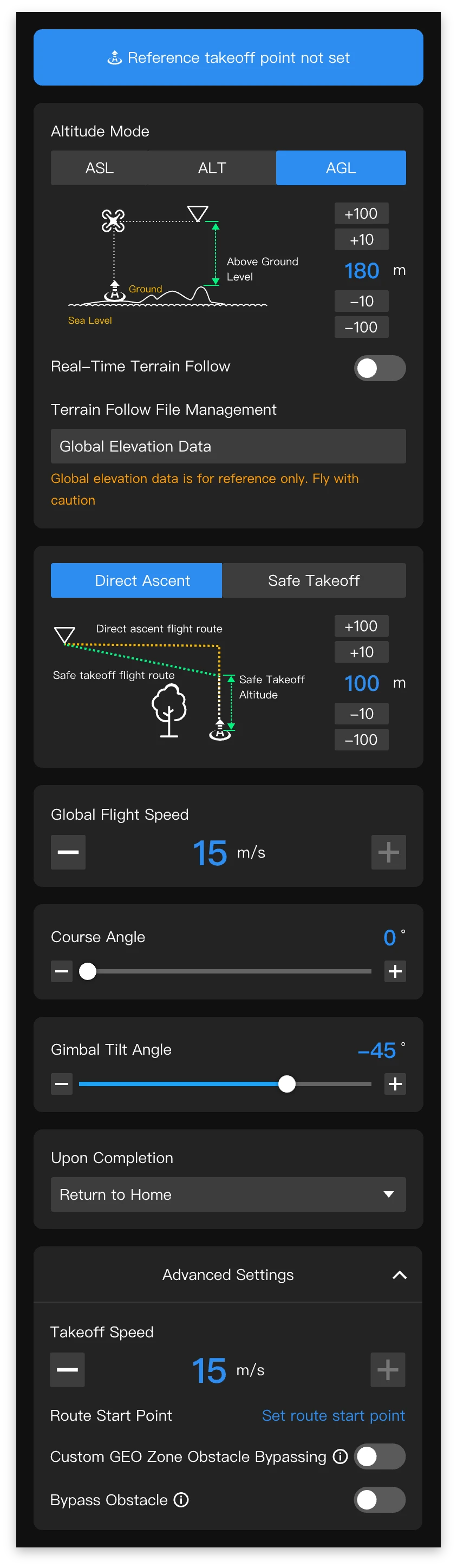 ほとんどの場合、ALTまたはAGL高度モードを選択し、実際のニーズに基づいて飛行高度を設定することをお勧めします。