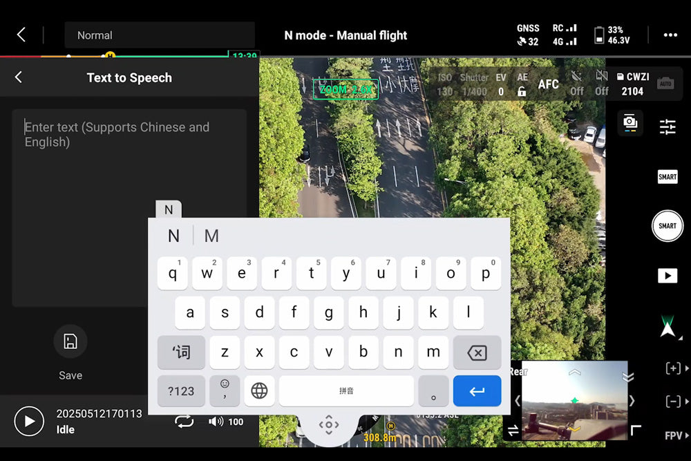 DJI Pilot 2アプリ経由で入力テキストを音声に変換し、スピーカーへ送信できます。このモードでは、音声のトーンや話す速度を調整でき、ループ再生にも対応。情報を明瞭かつ柔軟に伝えることができます。