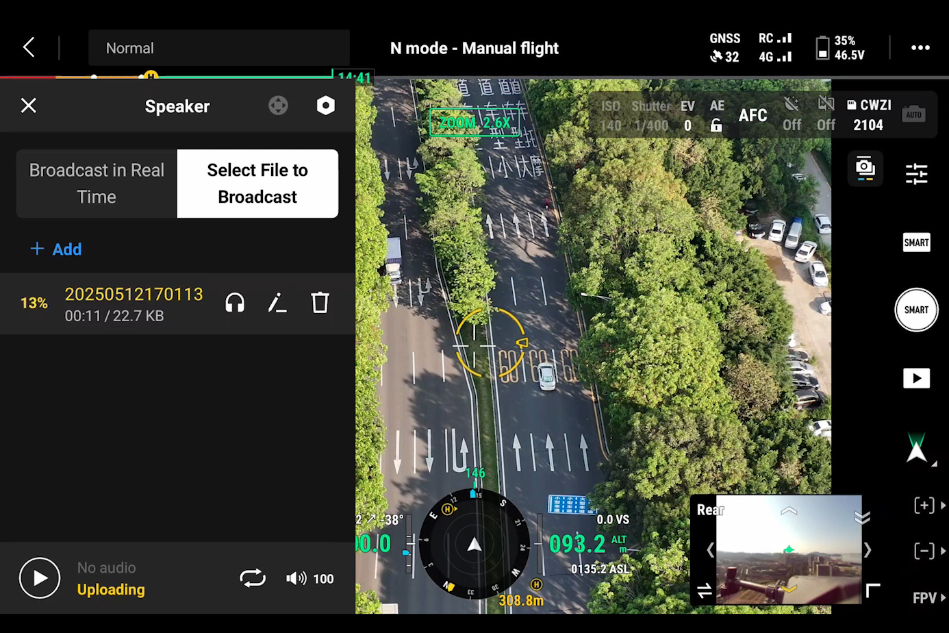 DJI Pilot 2アプリでは、ローカルオーディオファイルをインポートし、スピーカーで再生できます。Matrice 400とペアリングすると、Zenmuse V1はファイル転送と再生を同時にサポートします。これにより、プリセットコンテンツを即座に展開でき、作業効率とスムーズな運用を向上させます。