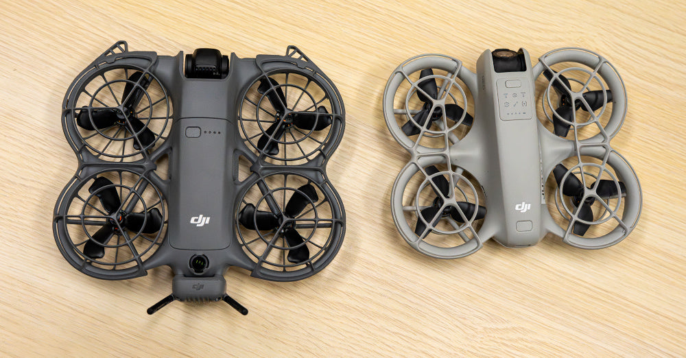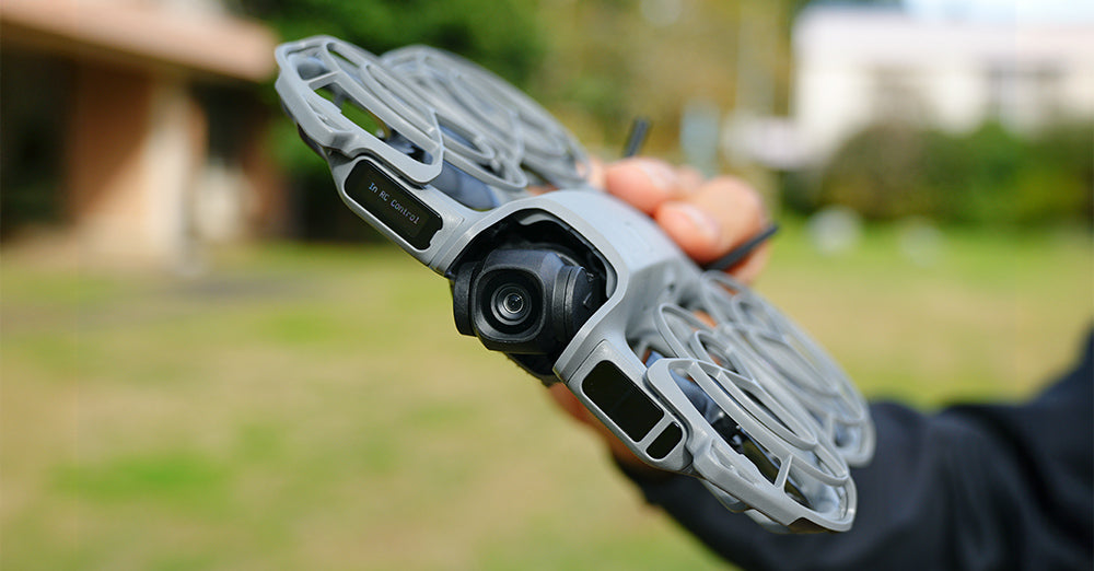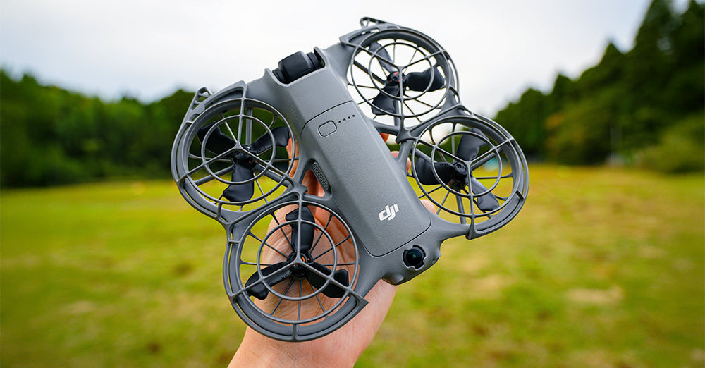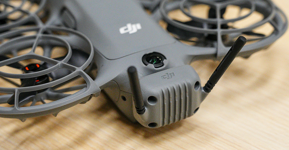 初代 DJI Neoから、機体のカラーリングと形状に変更が加わりました。 全体のサイズはわずかに大きくなりましたが、厚みはスリムになり、鞄のすきまにも収まりやすくなっています(DJI Neo 2 デジタルトランシーバー未装着時)。